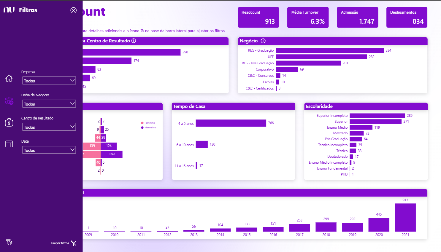 Dashboard de RH desenvolvido no Power BI com identidade visual inspirada no universo Nubank, explorando métricas de gestão de pessoas com modelagem dimensional e storytelling visual.